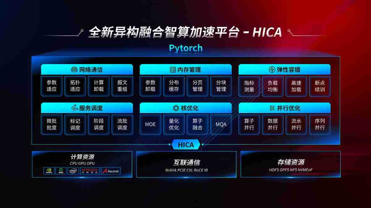 通过自研的服务层、、、中间适配层、、、、以及调度编排算法,,,采用数据并行、、模型并行等多种并行方式,,把并行计算任务进行有效的分解,,,,使其分别由相应的软件栈和算力资源来承接。。。当GPU资源变化,,,,HICA可以实时动态调度计算子任务并调整模型拓扑和架构,,,,以充分聚合各种算力资源。。。。