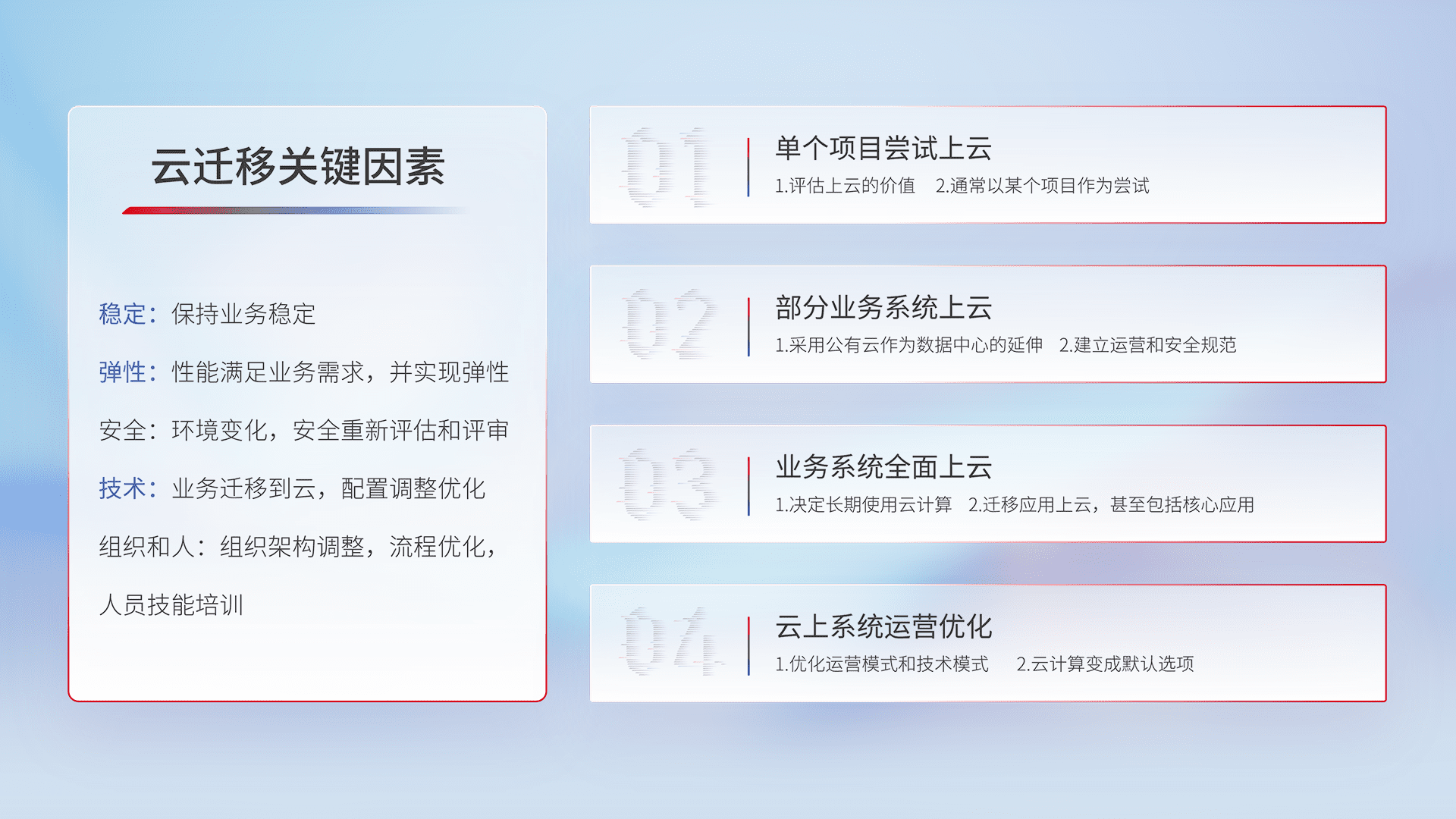 结合实际业务,,,,从规划设计、、、、云平台选型、、、云原生改造、、、、数据迁移、、、、集成交付,,,迁移全过程为客户识别最佳上云路径,,做好风险识别管理,,设计网络架构、、、、身份权限、、安全审计合规、、操作审计、、日志审计、、监控告警策略、、多站点容灾设计等,,对云上基础设施进行整体规划,,,,提升IT治理水平,,,以满足弹性、、、高可用、、、、高性能的需求。。。