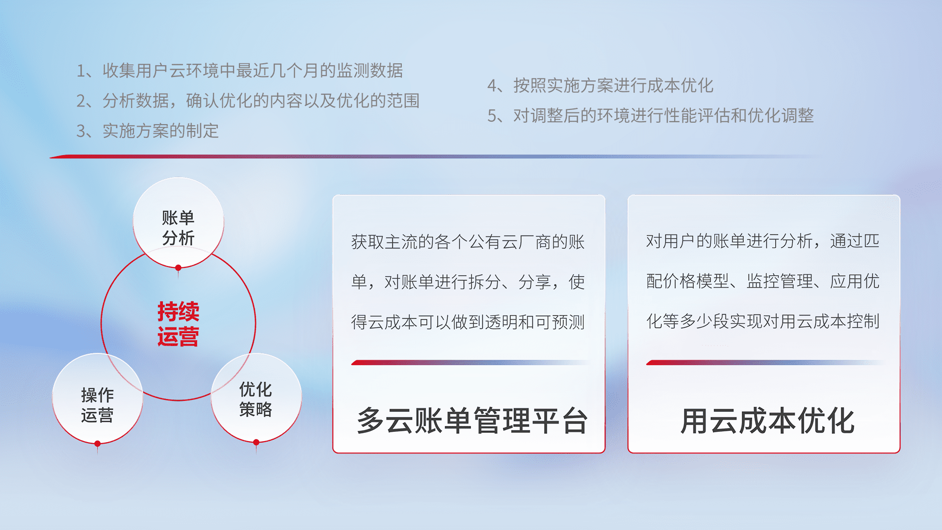 通过多云纳管,,以统一的资源数据模型把客户的云资源进行抽象和封装,,进而实现对多云资源的统一操作,,,保障云资源管理的可靠性、、稳定性与可用性。。。。量身定制化运维内容,,,配置、、开发运维、、、、补丁管理、、备份、、、监控、、、认证和访问管理、、、审计和日常巡检等,,,保障在用云过程中的可靠度,,稳定度以及高可用率。。